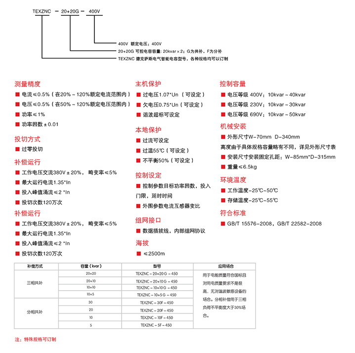 TEXZNC系列智能低压电力电容模块是针对0.4KV低压配电系统,实现高效节能、降低线损、提高功率因数和电能质量的新一代无功补偿产品。该系列产品主要使用于诺波污染不严重的场合。该产品主要由智能测控单元,晶闸管复合开关电路,高分判能力微型断路器,自愈式电器电容器以及通讯模块经过合理的结构设计集成于一体,以取代传统的无功补偿方式。