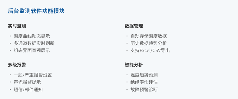 通过多通道多点监测,系统能够精准定位绕组顶层、中层、底层的热点区域,及时发现局部过热隐 患,为变压器安全运行提供可靠保障。系统采用荧光寿命法测温原理,传感器预埋于绕组内部,直接采集本体温度,精度可达±1℃,响应时间≤1秒